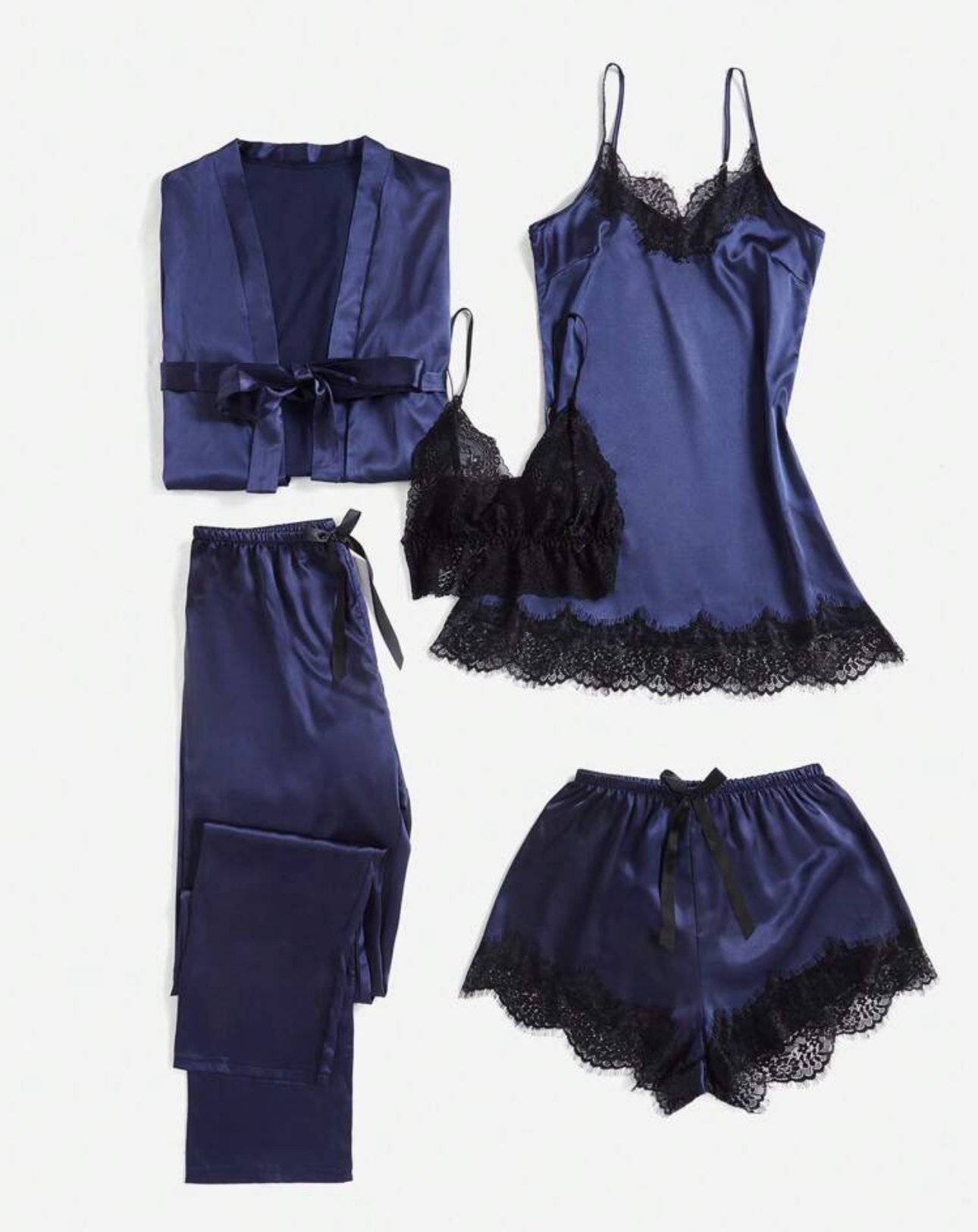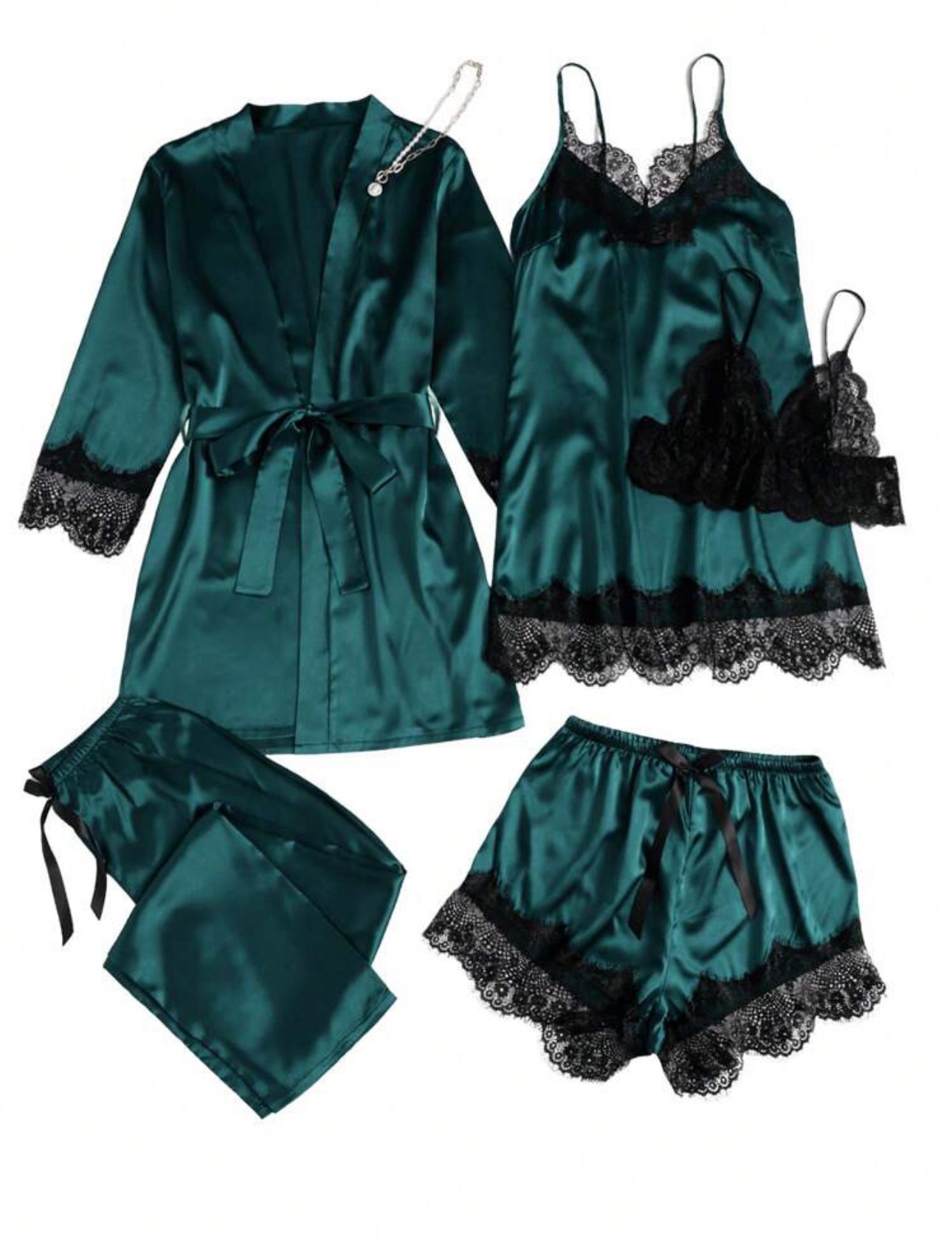 5 piece nightwear set with contrast lace, belt, satin