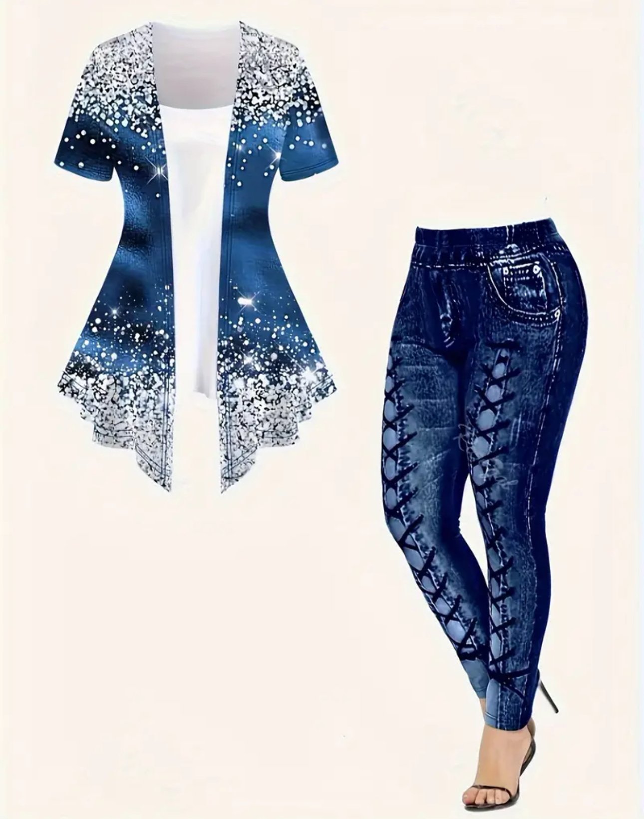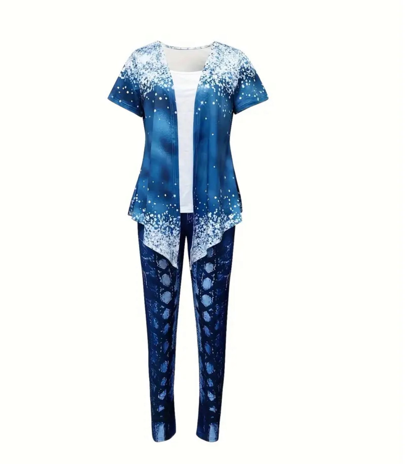 Casual Patchwork Print Knitted Two-piece Pants Set, Long Sleeve Ruffle Trim Top & Skinny Elastic Waist Pants Outfits, Women’s Clothing.