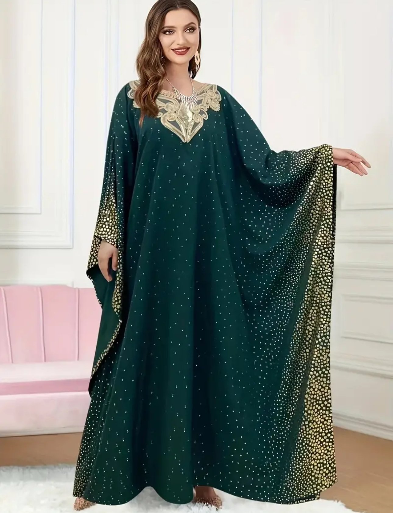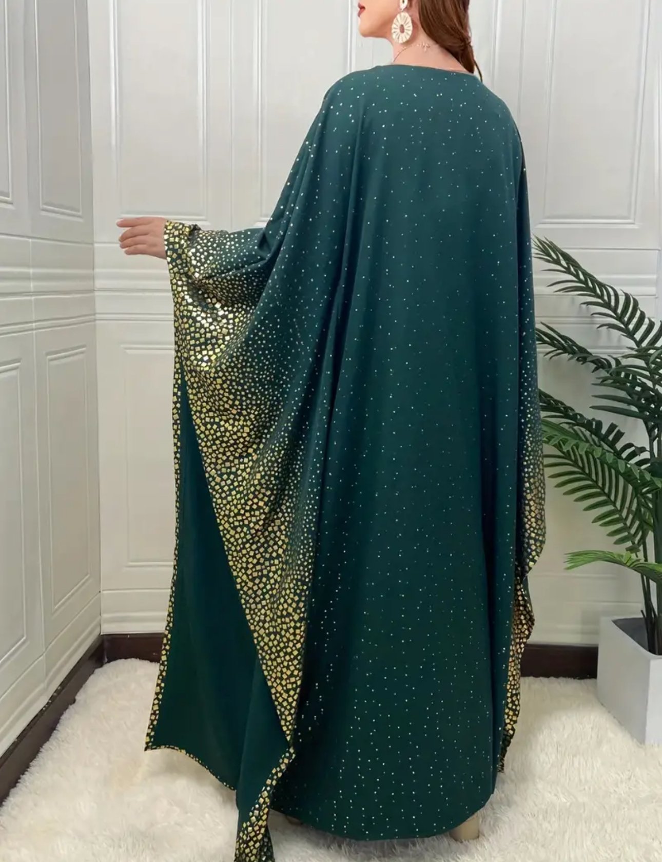 Ramadan Rhinestone & Apple Print Crew Neck Kaftan Abaya, Modest Batwing Sleeve Maxi Dress, Women’s Clothing